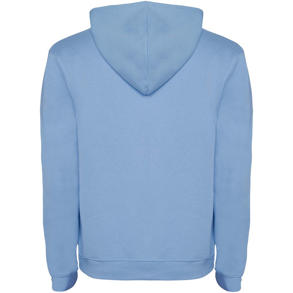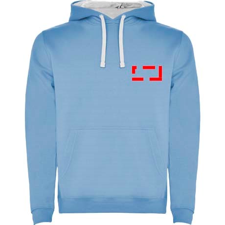Tweekleurige hoodie met dubbele stof. Versterkte bedekte naden in de kraag en kangoeroezak. 1x1...meer