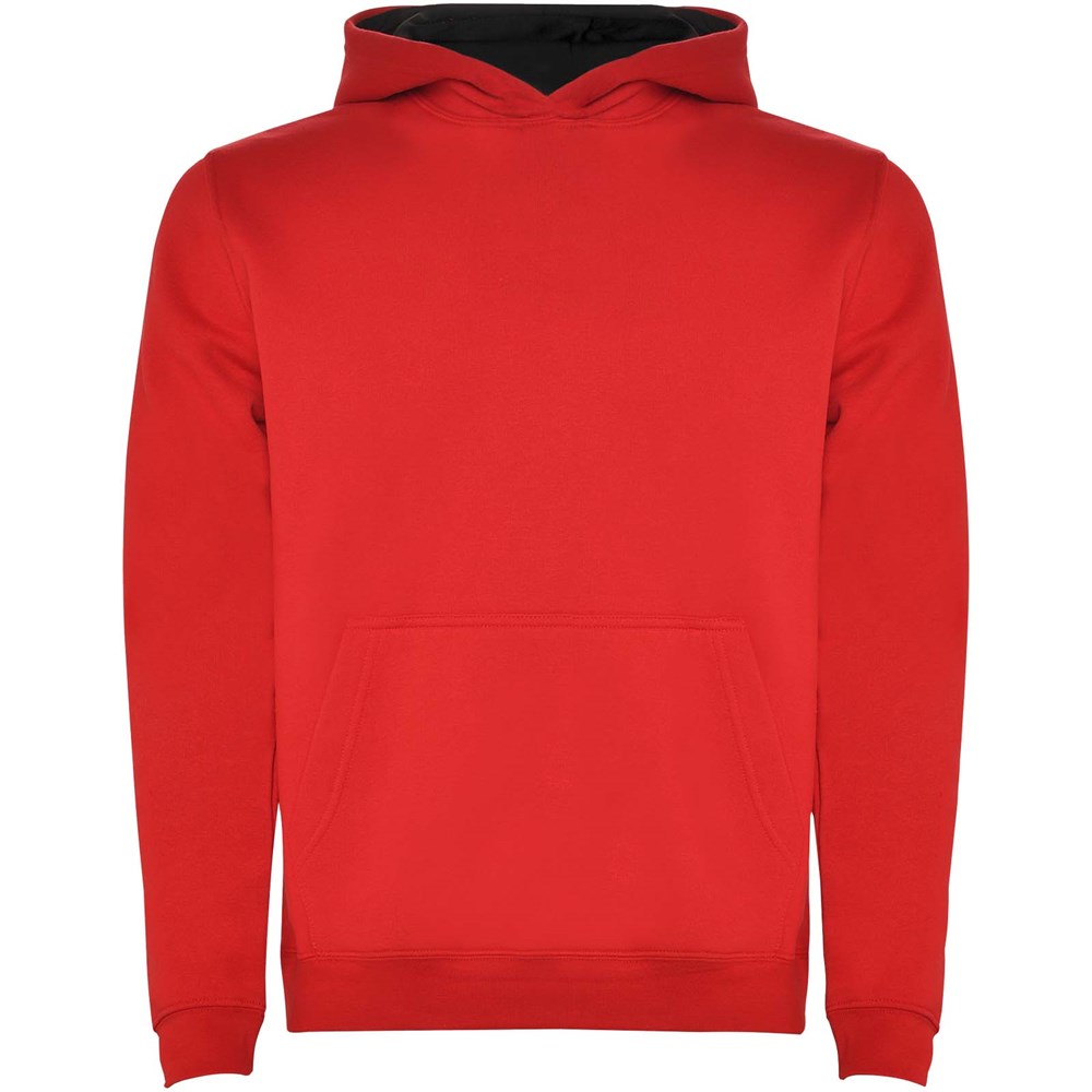Tweekleurige hoodie met dubbele stof. Versterkte bedekte naden in de kraag en kangoeroezak. 1x1 elastaan rib in manchetten en tailleband. Verwijderbaar etiket. Het model is 120 cm en draagt maat 5/6.