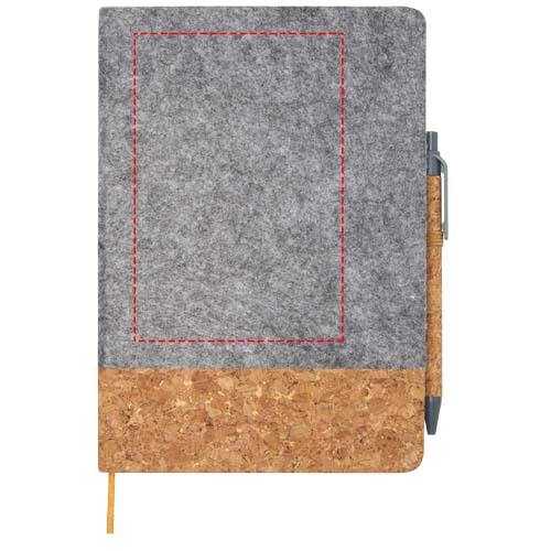 Het A5 notitieboek met harde kaft is gemaakt van kurk en gerecycled vilt en heeft 80 gelinieerde vellen papier van 70 g/m², een elastische sluiting, een lintmarkering en een penlus. De knop, clip en punt van de balpen zijn gemaakt van gerecycled plastic en de houder is gemaakt van kurk. Peninkt: zwart. Schrijflengte: 600 meter. Stiftmaat: 1,0 mm.