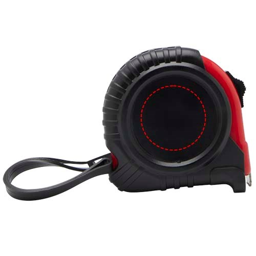5 meter rolmaat met weergave in centimeters en inches, voorzien van een handige riemclip voor gemakkelijk meenemen.