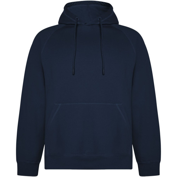 Unisex hoodie van biologisch katoen en gerecycled polyester. Kangoeroezak. Enkele jersey voering in capuchon. Rond verstelbaar trekkoord en geborduurde oogjes. Manchetten en tailleband van 2x1 geribde stof. Verwijderbaar etiket. Individuele gerecyclede verpakking. Het mannelijke model is 185 cm en draagt maat L en het vrouwelijke model is 168 cm en draagt maat S.