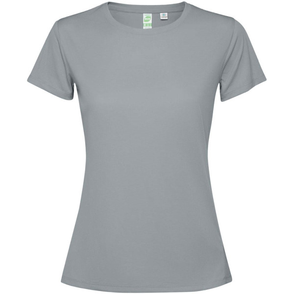 Getailleerd technisch T-shirt met korte mouwen voor dames. Kraag met bijpassende naden. De zoom aan de achterkant is iets langer dan aan de voorkant. Zijnaden naar voren verschoven.