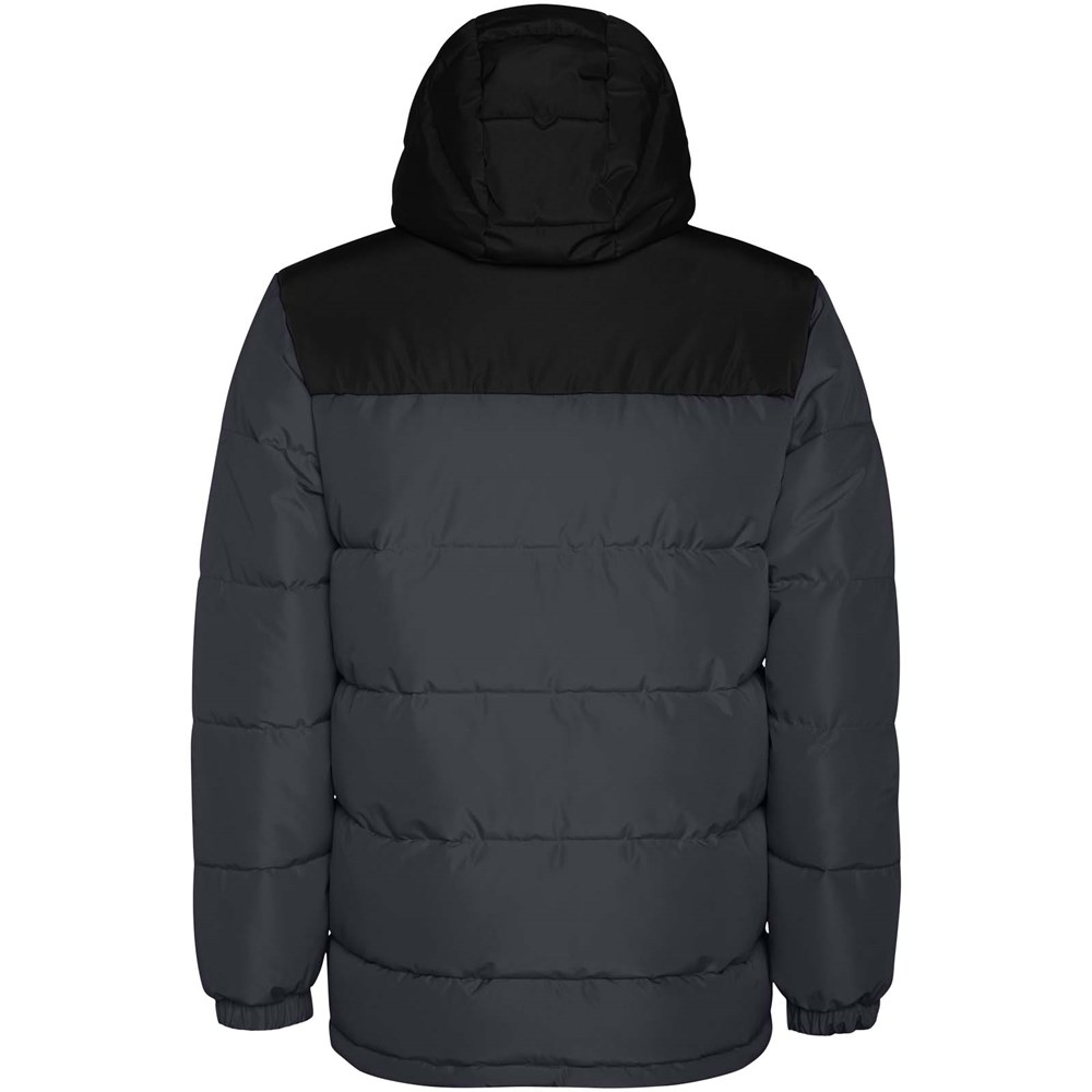 Gewatteerd jack met vaste capuchon. Rits aan de voorkant bedekt met een sluiting. Kinbescherming. Twee zijzakken met rits. Elastische manchetten.