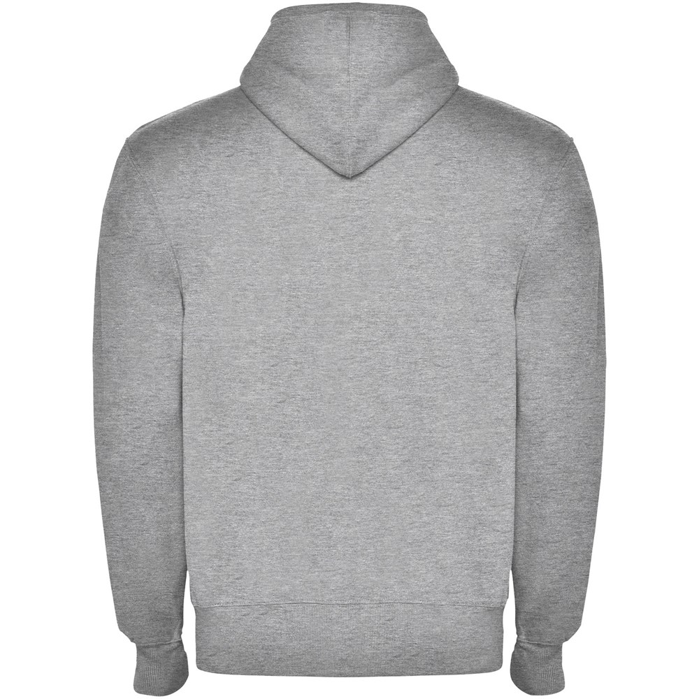 Sweatjack met capuchon, hostaande kraag en volledige rits. Geribbeld detail in capuchon en zakbies. Kangoeroezak. 2x2 ribboord aan manchetten en taille. Verwijderbaar etiket. Het model is 184 cm en draagt maat L.