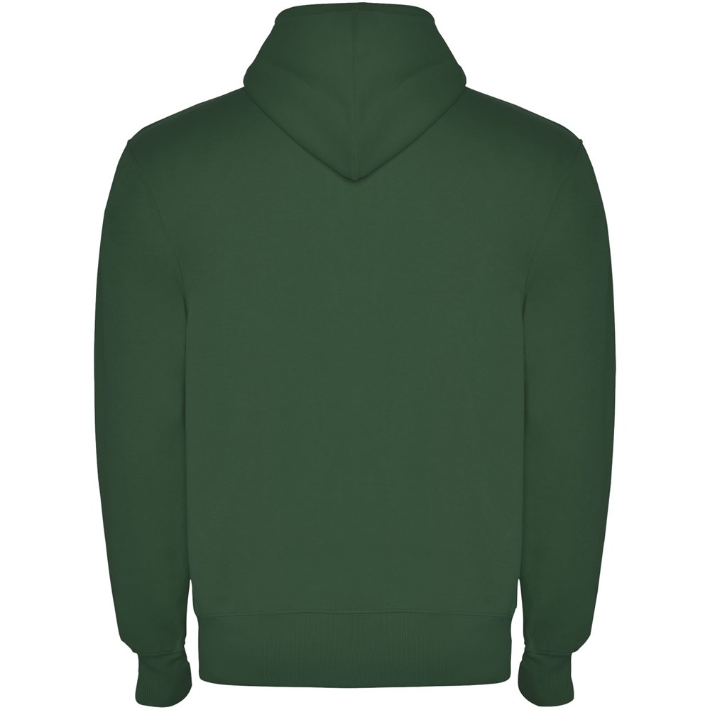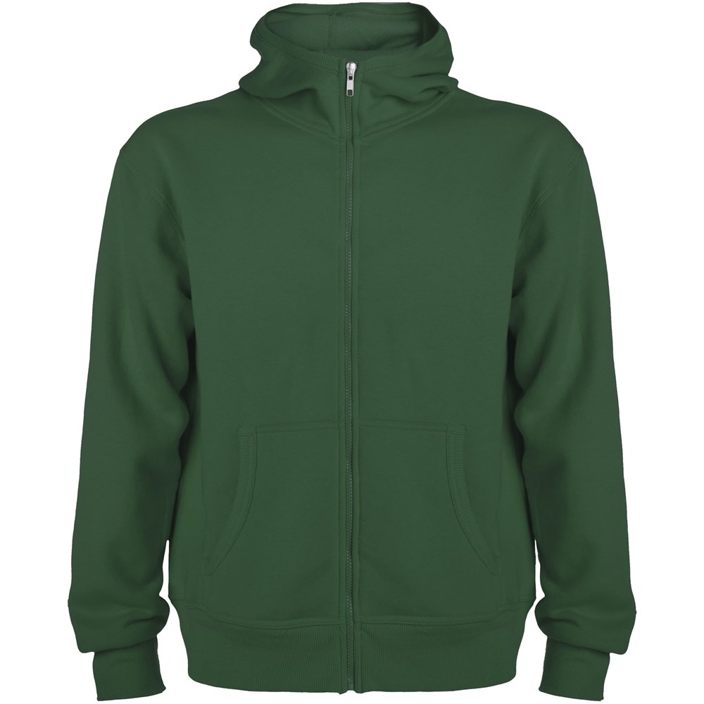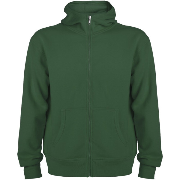 Sweatjack met capuchon, hostaande kraag en volledige rits. Geribbeld detail in capuchon en zakbies. Kangoeroezak. 2x2 ribboord aan manchetten en taille. Verwijderbaar etiket. Het model is 184 cm en draagt maat L.