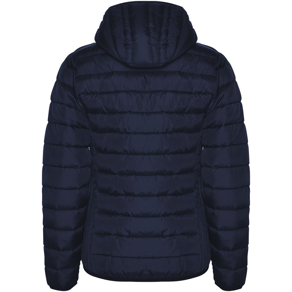 Gewatteerd damesjack met dons en aansluitende capuchon. Omgekeerde ritsen met bijpassende kinbeschermer. Twee voorzakken met rits. Bijpassende elastische bies in manchetten, zoom en capuchon. Contrasterende binnenvoering. Licht en opvouwbaar kledingstuk. Nauwsluitende pasvorm. Waterafstotend. Winddicht model.