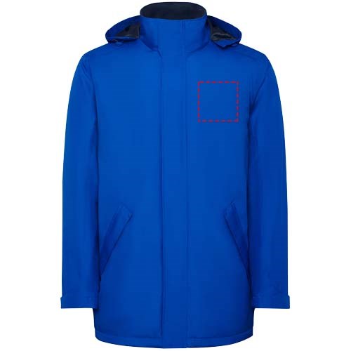 Waterdichte gewatteerde parkajack voor heren. Hoge kraag met omgeslagen en afneembare capuchon met klittenbandsluiting. Bijpassende centrale rits met flap. Zijzakken met rits en vaste klep. Binnenzak met klittenbandsluiting. Verstelbare manchetten met riemlus met klittenbandsluiting. Interne toegang voor verstevigingen op de rug en linkerborst.