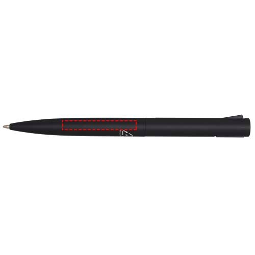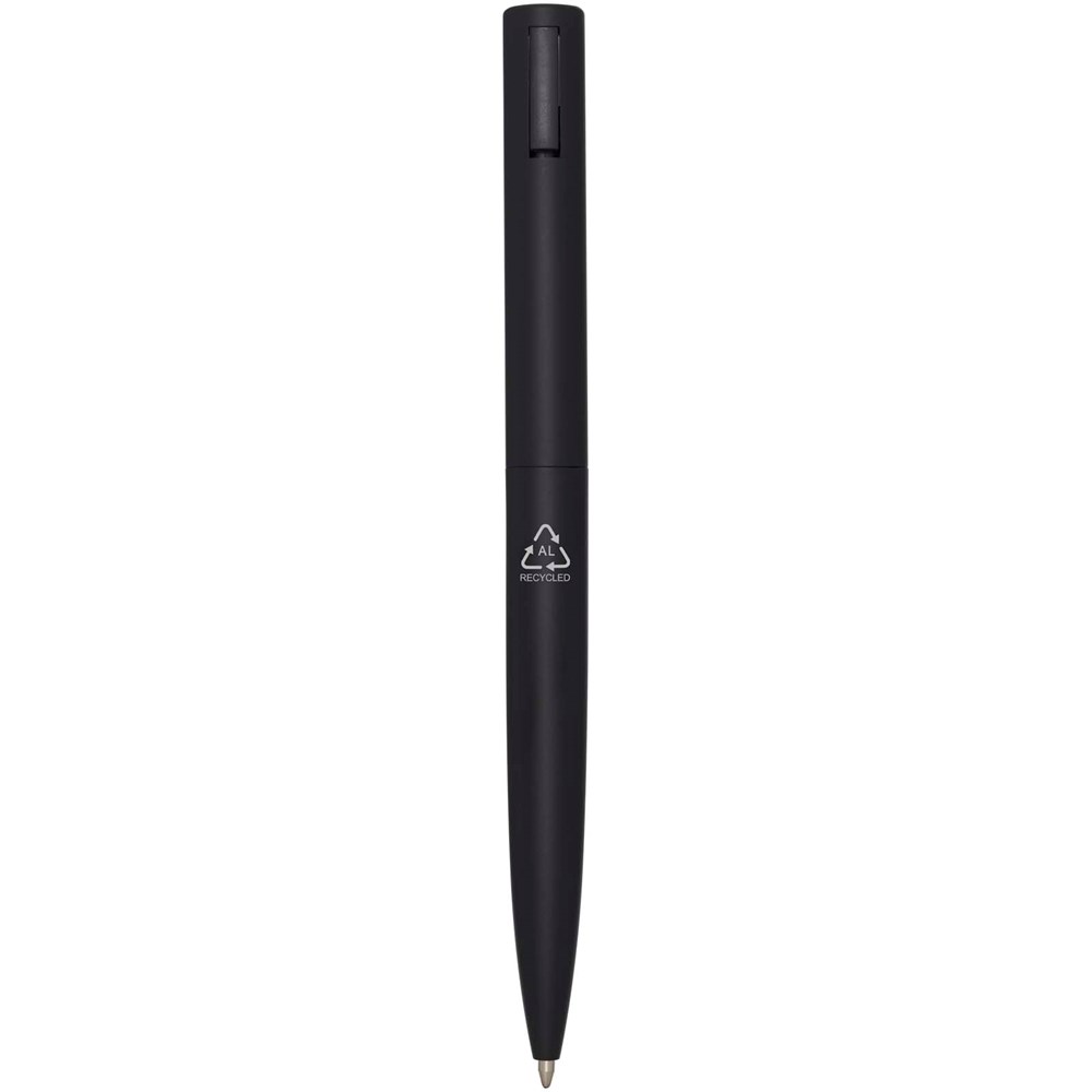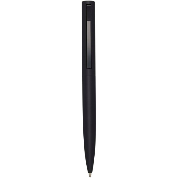 Balpen waarbij het bovenste deel van de pen is gemaakt van gerecycled plastic en het onderste deel van gerecycled aluminium. De pen is voorzien van een veerbelaste, kantelbare metalen clip, waardoor hij eenvoudig kan worden bevestigd aan dikkere items zoals tassen of notitieboeken. De clip klikt hoorbaar bij het omklappen. Inktkleur: blauw. Schrijflengte: 1000 meter. Puntdikte: 1,0 mm.
