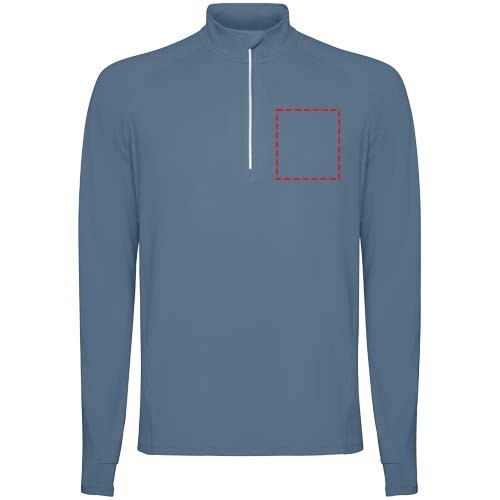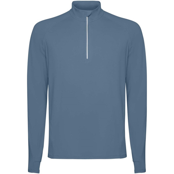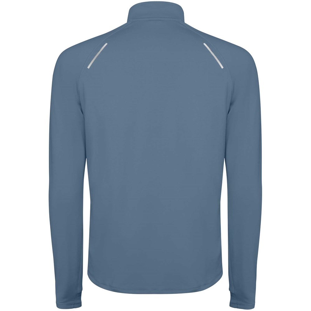 Technische raglan sweater met lange mouwen voor heren. Kraag met een halve rits en een omgekeerd ontwerp met reflecterende details. Verstevigde naden. Manchetten met duimopeningen. Reflecterende details op de achterkant. De zoom aan de achterkant is iets langer dan aan de voorkant. Warme geborstelde binnenstof.