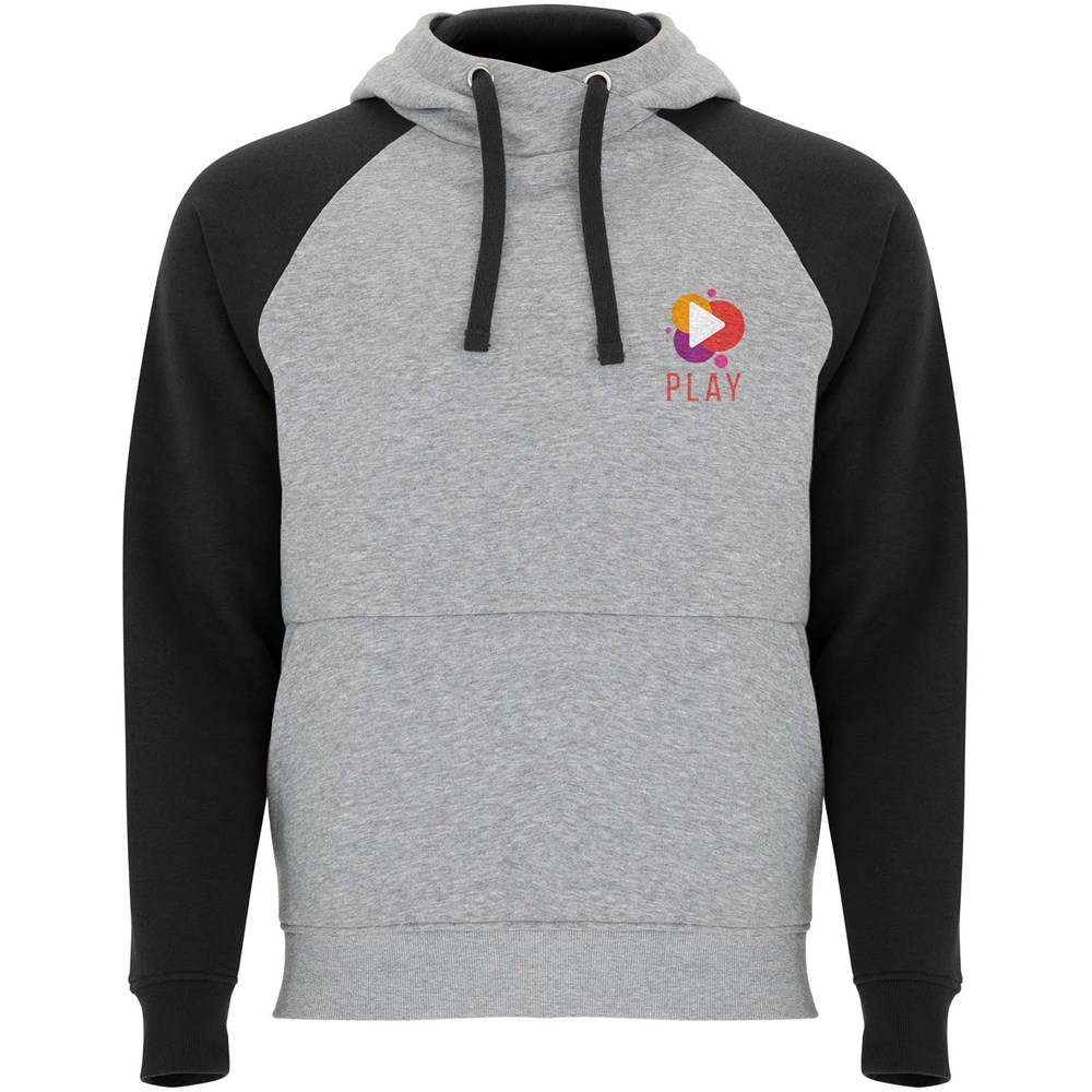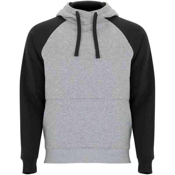 Tweekleurige unisex hoodie. Capuchon met gekruiste hals en metalen oogjes. Contrasterende binnenkant van de capuchon, trekkoord en raglanmouwen. Kangoeroezak. Manchetten en zoom van 1x1 ribgebreid elastaan. Verwijderbaar label.