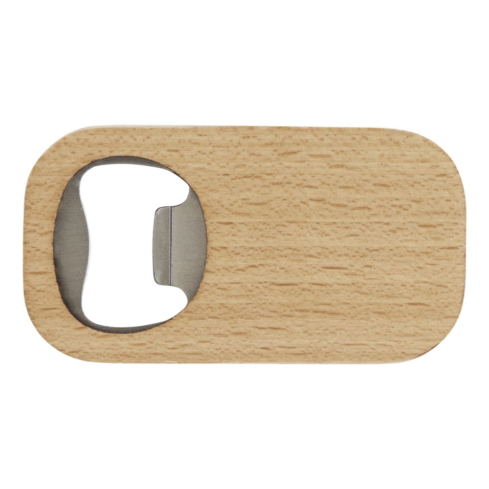 Roestvrijstalen flesopener met houten oppervlak.meer